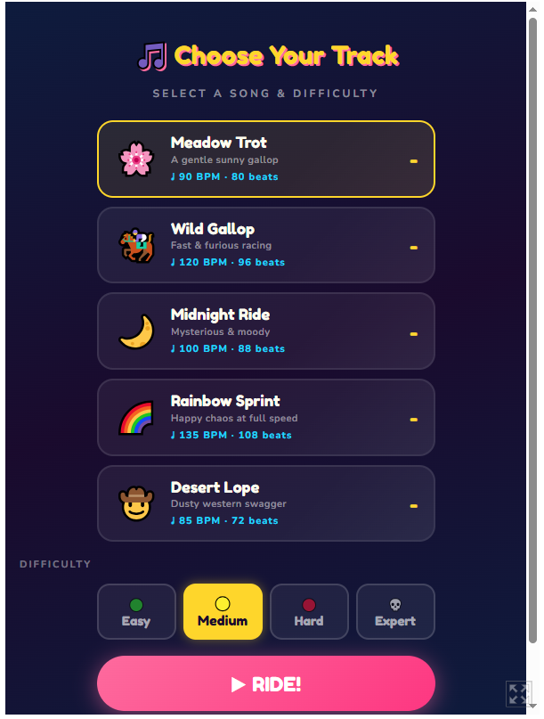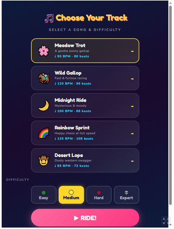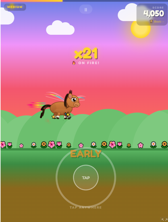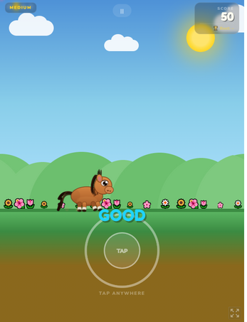 Tap to your heartbeat, or at least to the beat of the song :) Enjoy a simple escape from reality and emerse your self in a cute pony gallop through songs and find your rhythm :) Just follow along and tap tap tap, to make the pony fly with joy.